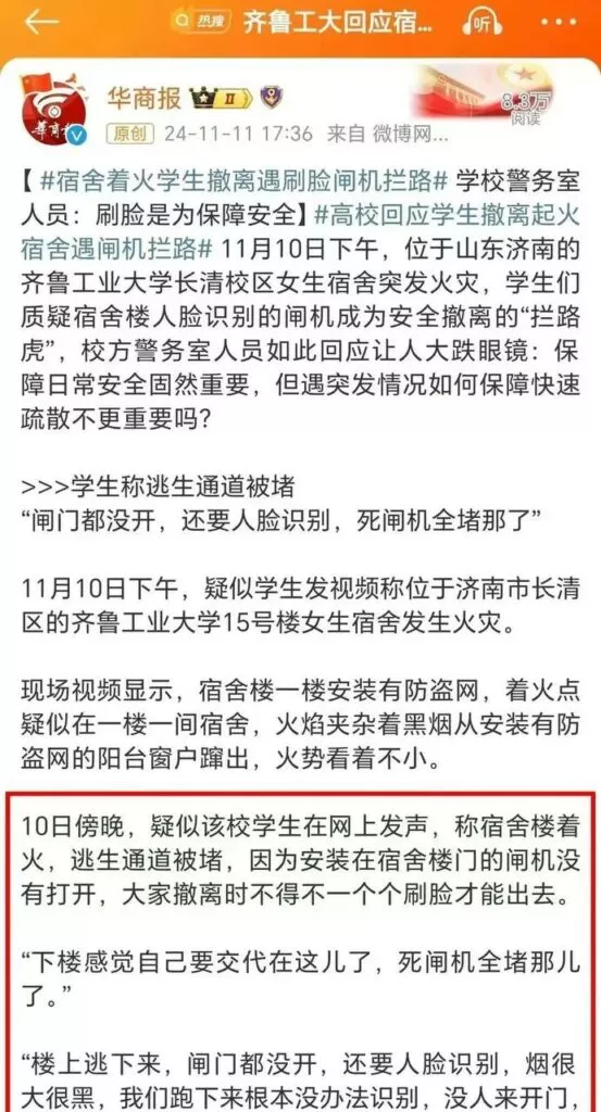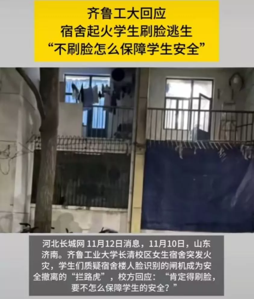 刷脸逃生?齐鲁工业大学女生宿舍起火楼道闸机成拦路虎