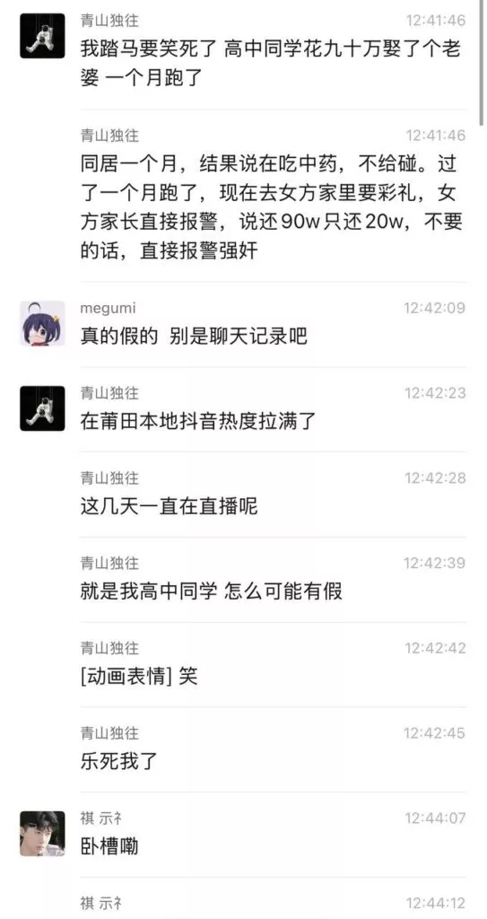 比大同订婚QJ案更离谱的事发生了,这次还是新婚不到一月的准夫妻。福建莆田一男子花费高达90万彩礼娶了老婆回家,结果不到一月,妻子就跑回老家悔婚,岳父家更是放话彩礼只退20万,不同意就告男子QJ罪。