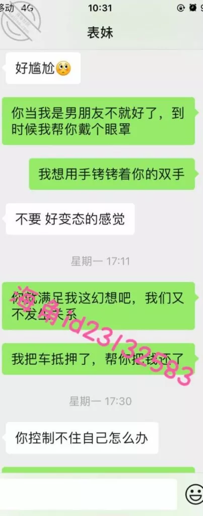 上周五用小号提醒表妹准时还款,果然她要还不上了,先吓一下她要发视频给家人,然后说9000陪我睡两晚,她就不理我了。