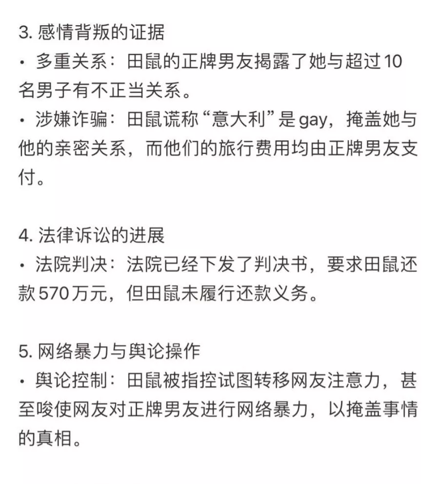 在抖音上拥有21万粉丝的女网红田叔特工,自我塑造的形象是一位在英国留学的富家千金。然而,事实上,她所有的财富都来自于男友。在与男友长达六年的恋爱关系中,她花费了高达1300万元。更令人震惊的是,男友发现这位伪装的千金在私下里与数十名男性发生不正当关系,并拍摄了大量不雅视频。愤怒之下的男友决定将她告上法庭,以维护自己的权益。