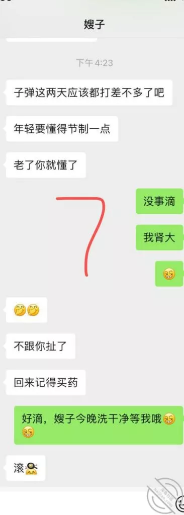 叫我给侄子买药回去,他一一个人出门不方便,聊着聊着就提醒我节制点。可能是想让我多留点子弹回去给她吧「不了解的兄弟可以看,上一个贴我和嫂子的聊天截图」我也顺水推舟叫她今晚洗好等我!