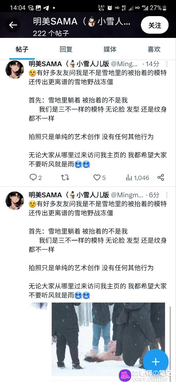 实际上,是一位推特的人体摄影师在雪场拍摄人体写真照片,并没有冻僵也没有什么野战,更没有什么泄漏视频,所以瓜友们不要上当了